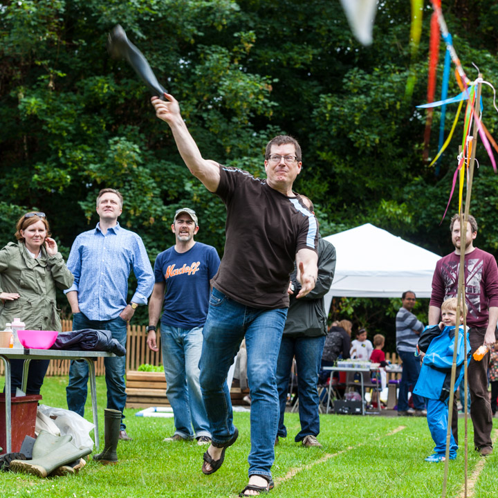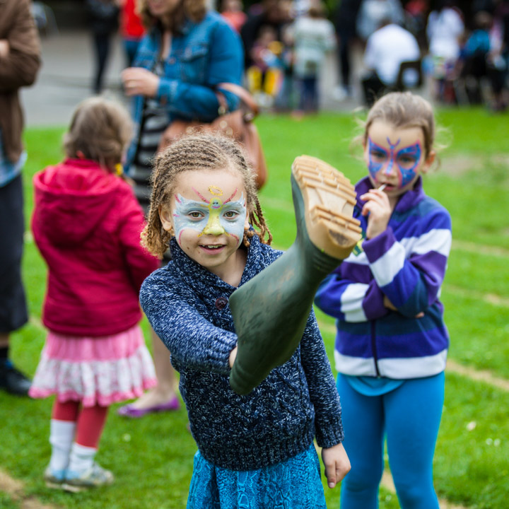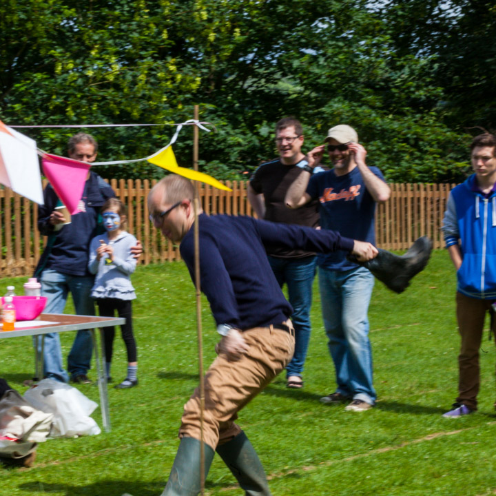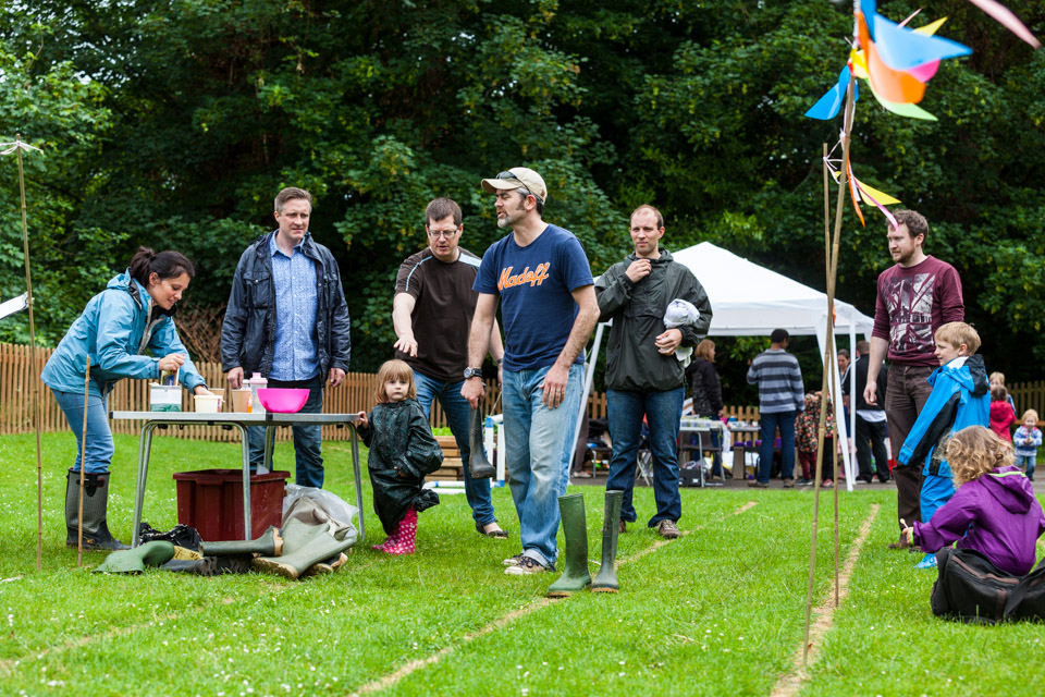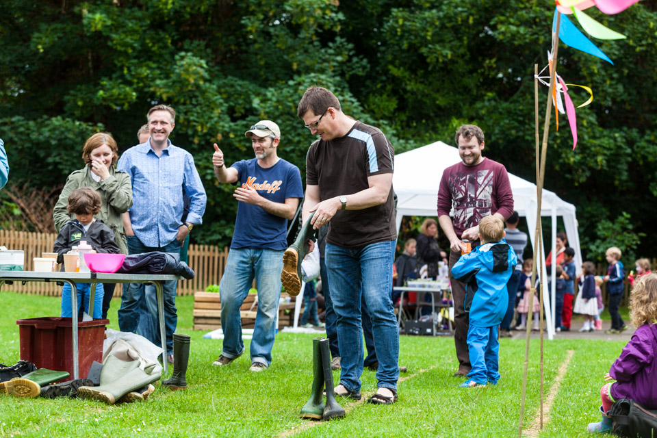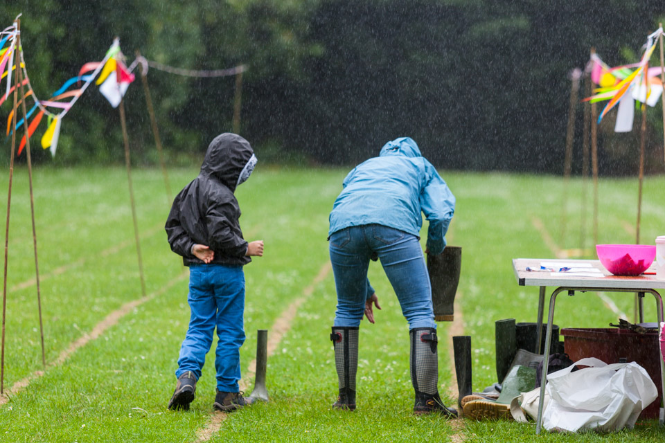 Jess and Oscar getting wet at the Wellie wanging...